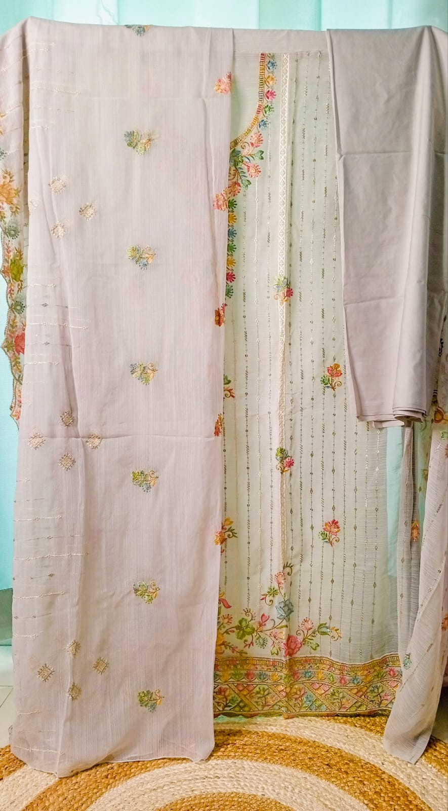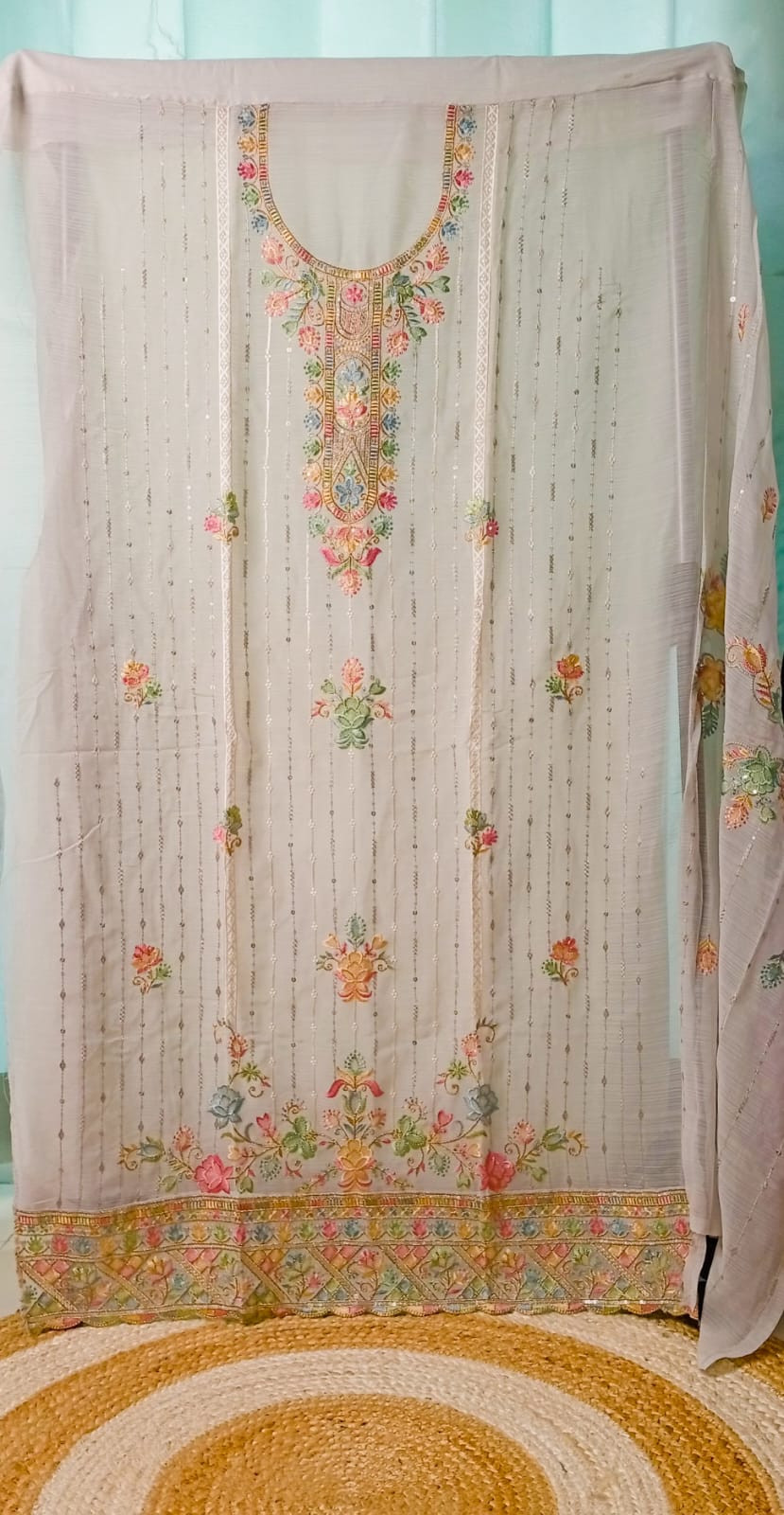 Pure Georgette Full embroidery work with colourful thread and sequins.